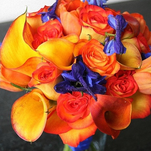 Orange M. Calla, Orange, Tulips, Orange Roses Many more color variations and variety combinations possible. This offer includes more than one flower type. Shipping cost excluded from estimate!